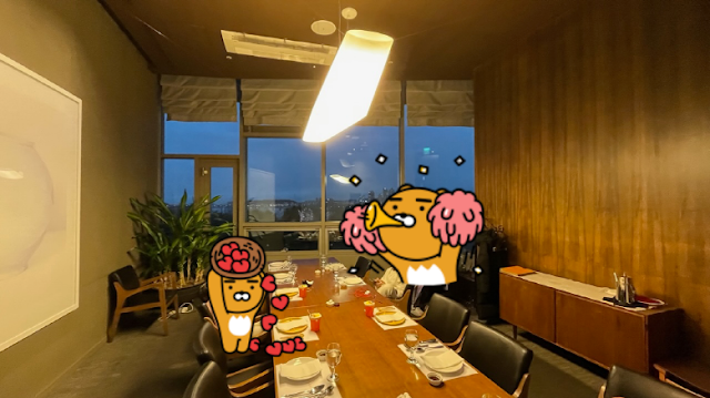 사진상으로만 보면, 식당이 매우 큰가? 라고 오해하기 쉬운데, 식당규모는 매우 작다. 12명이 앉을 수 있는 대형 단체룸이 1개 있고, 메인 식당 공간에는 대략 4인용 식탁 3~4개가 배치되어 있었다. 규모는 작은 편이다. 단체룸은 매우 넓다. 저녁식사라 어둑어둑 했지만, 단체룸 및 메인 식당공간 모두 한강이 보인다. 단체룸에서는 창문에 기대어 보면 국회의사당도 보인다. 메인 식당공간에서는 창가 바로 옆 자리는 1개 밖에 없어 보였다. 그래도 메인식당공간에서도 한강 뷰 외부가 잘 보일 정도로 창문은 매우 크다. 우린 단체룸에서 식사를 했는데, 매우 좋은 경험이었다. 직원들도 친절했고, 코스요리도 좋았다.